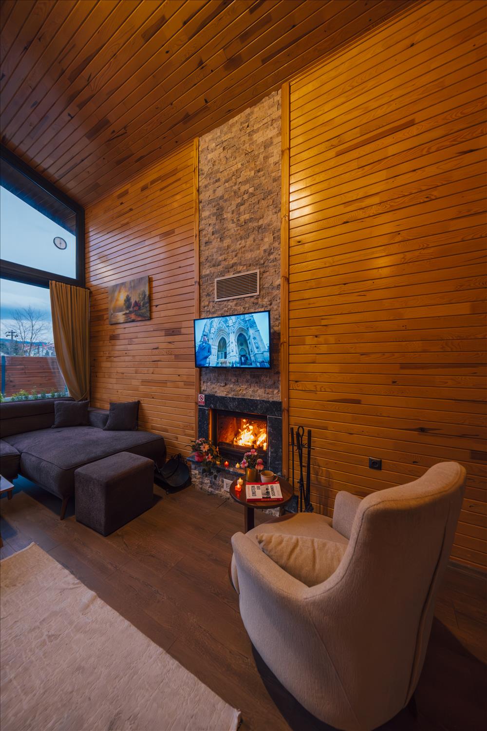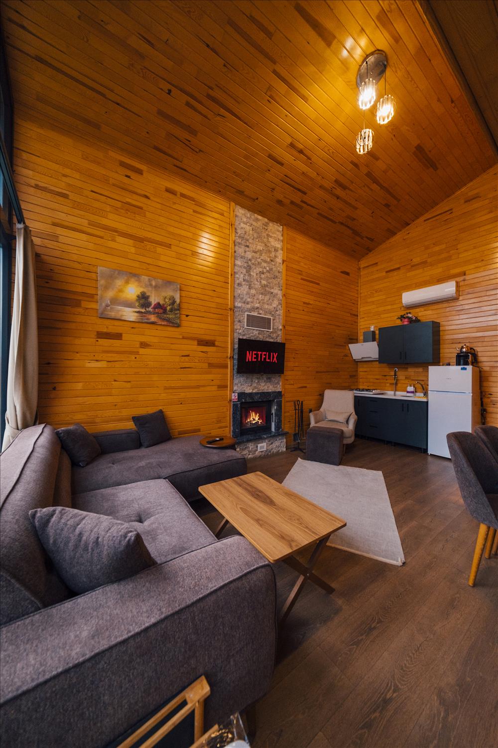 Büyük buz dolabı, led ekran, tv, güçlendirilmiş internet, madam coco, karaca, mutfak ekipmanları, çaycı, türk kahve makinası, gerçek odun şöminesİ
