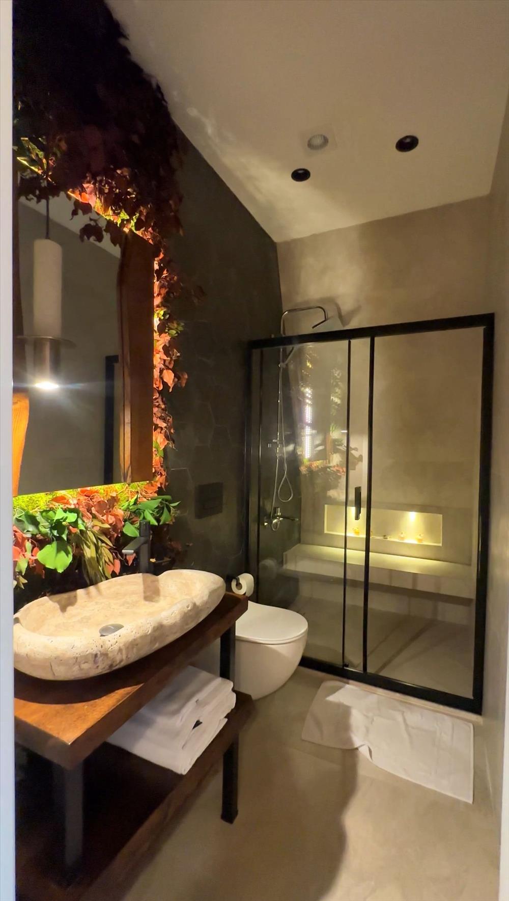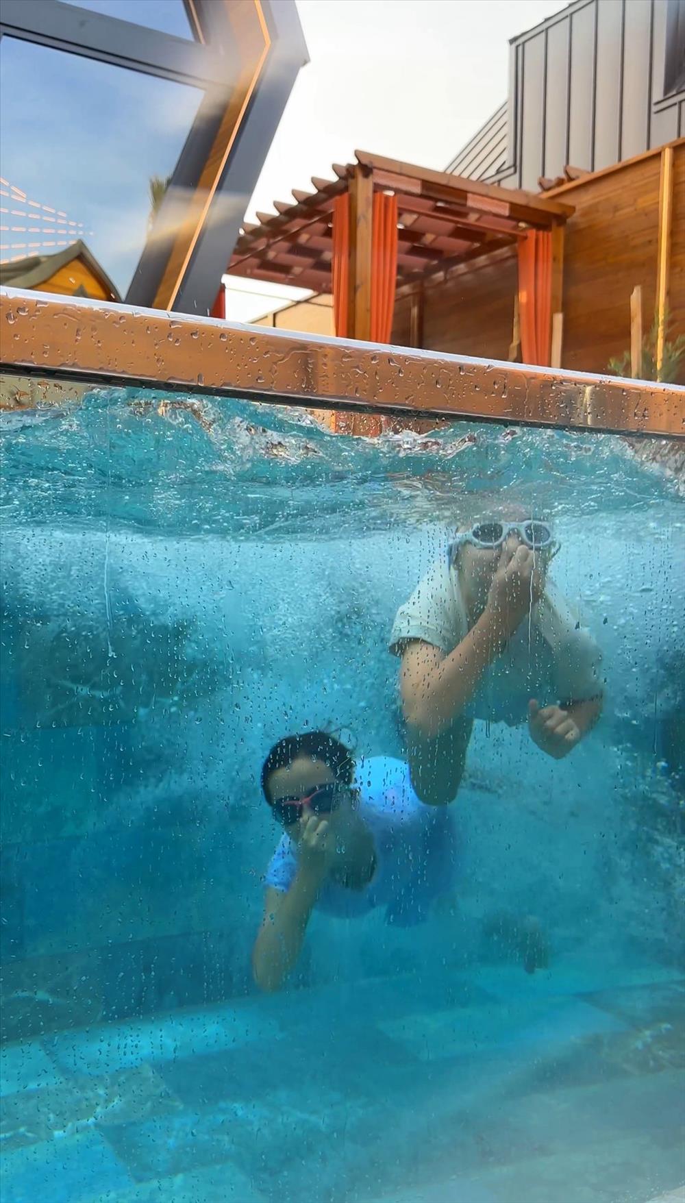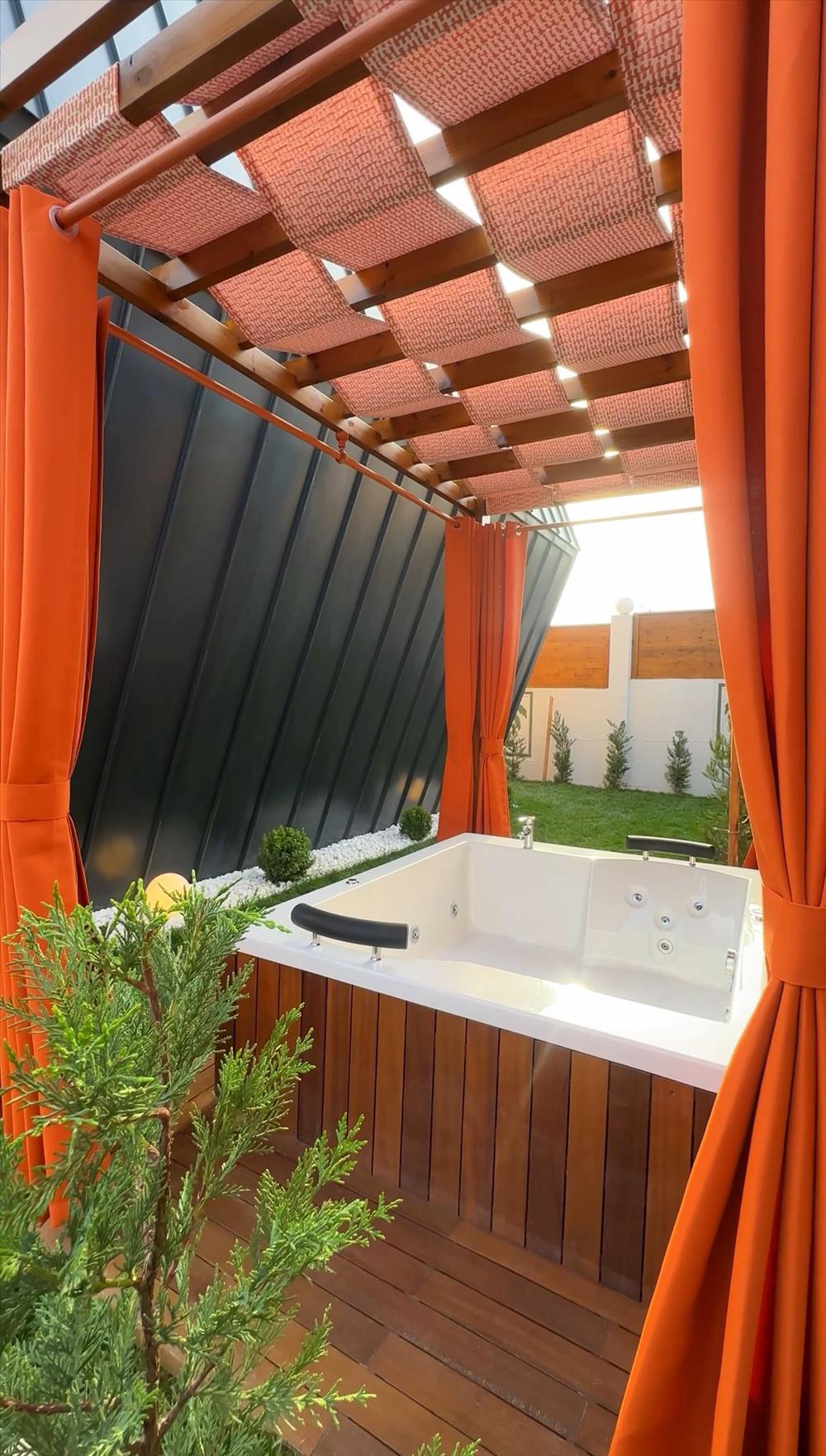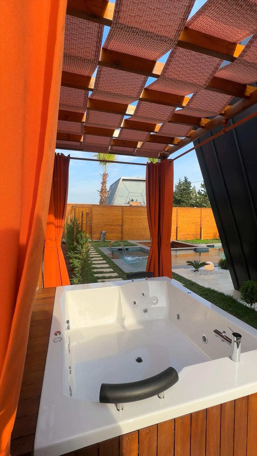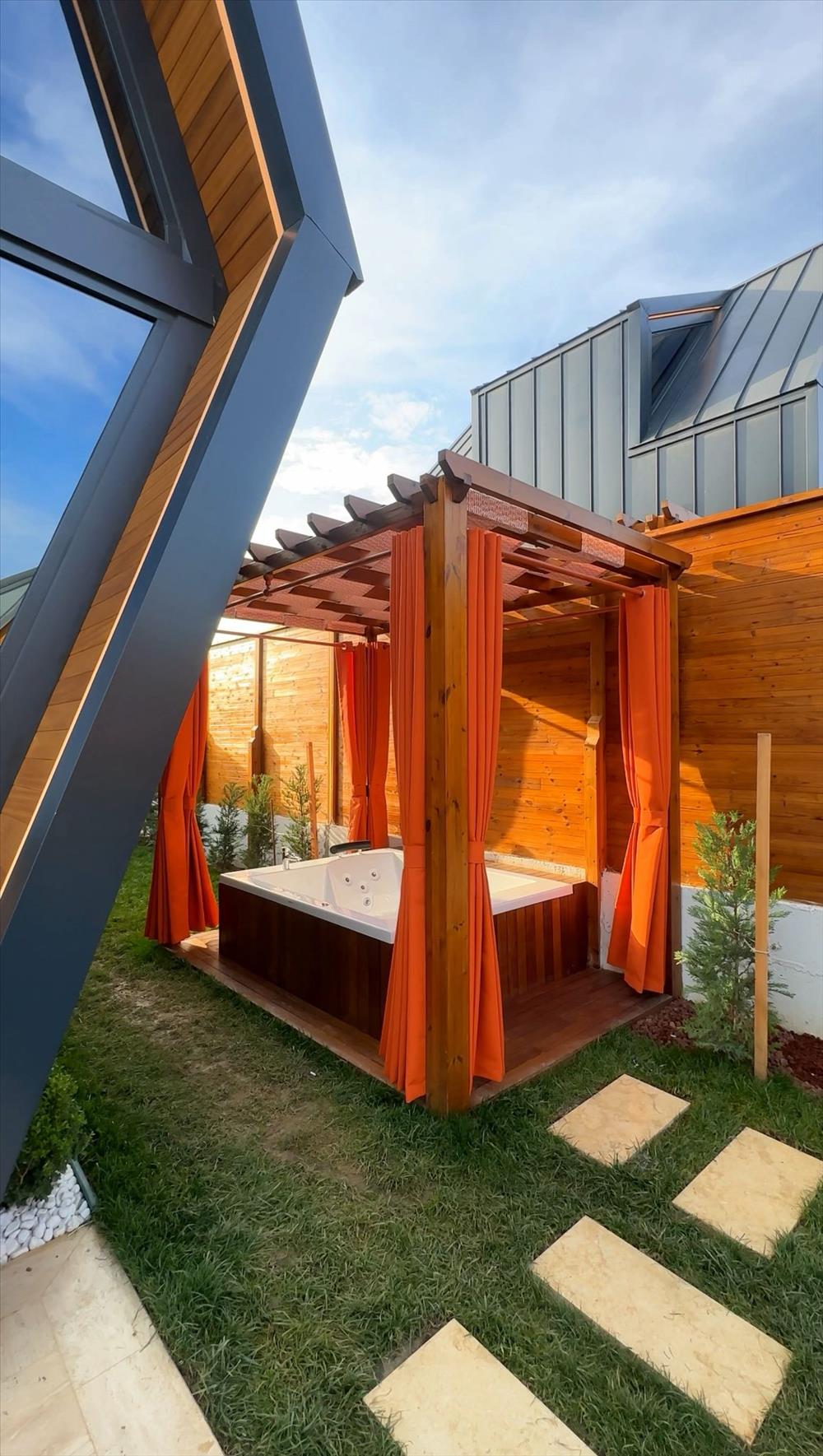 Bahçe alanında 2 kişilik geniş jakuzi, yatak odasında ise küvet bulunmaktadır.