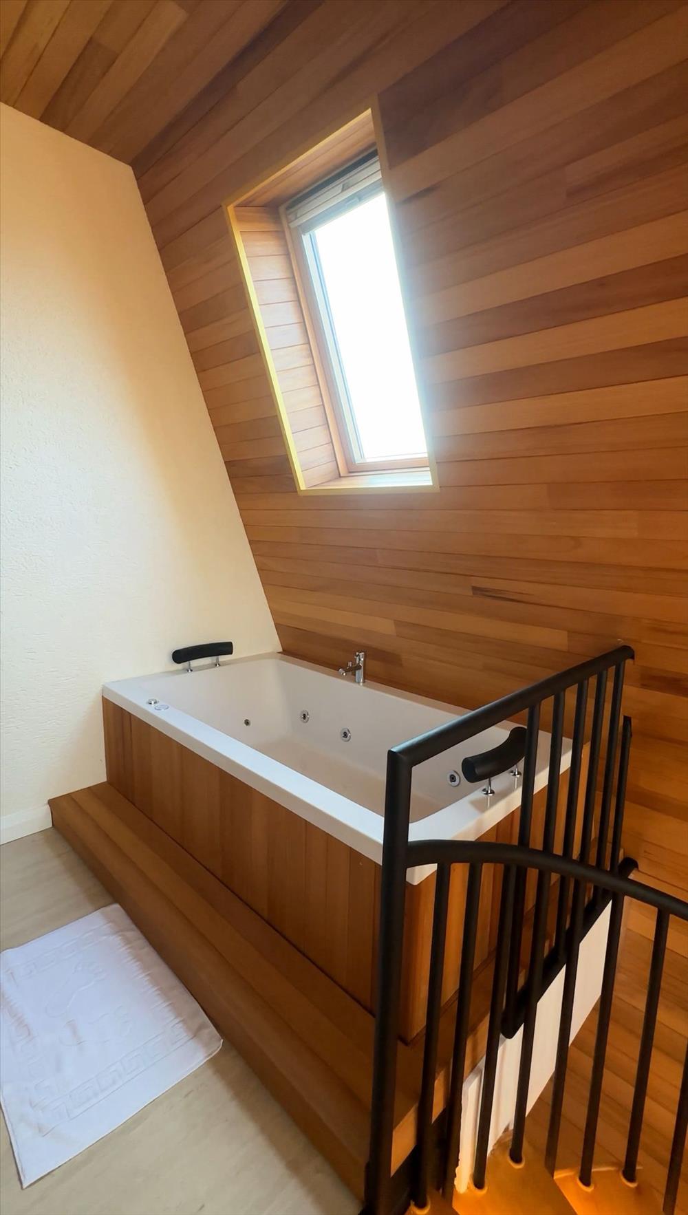 Bahçe alanında 2 kişilik geniş jakuzi, yatak odasında ise küvet bulunmaktadır.