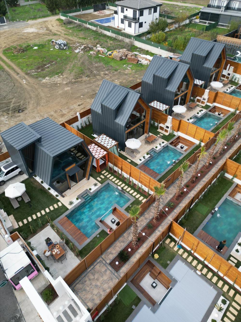Havuz alanı dışarıdan veya karşı evlerden görünmüyor. Ama bahçe alanının ileri alanları karşı evlerin üst katından görünmektedir.